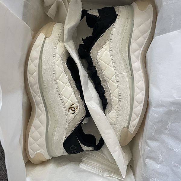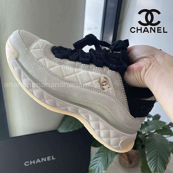 とっても可愛くておしゃれなシャネルトレーナーズ。こちらはヒールが少し厚めでココマークアイコンの人気のスタイルのスニーカーです。